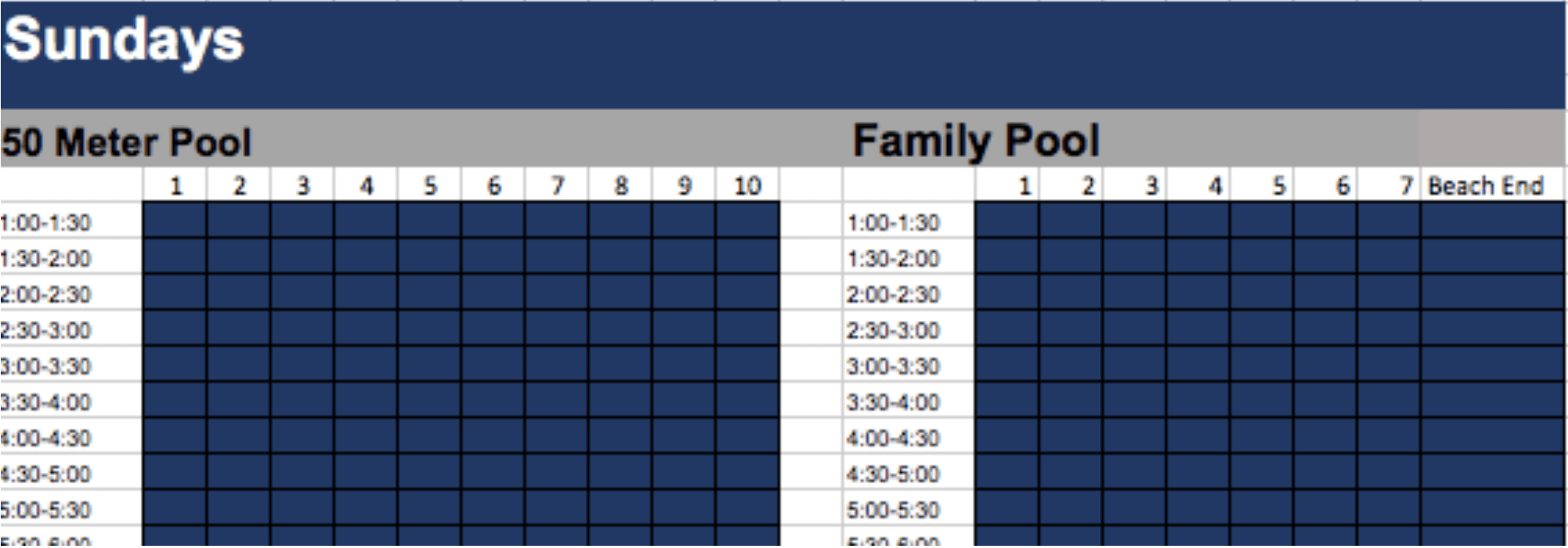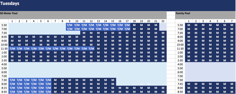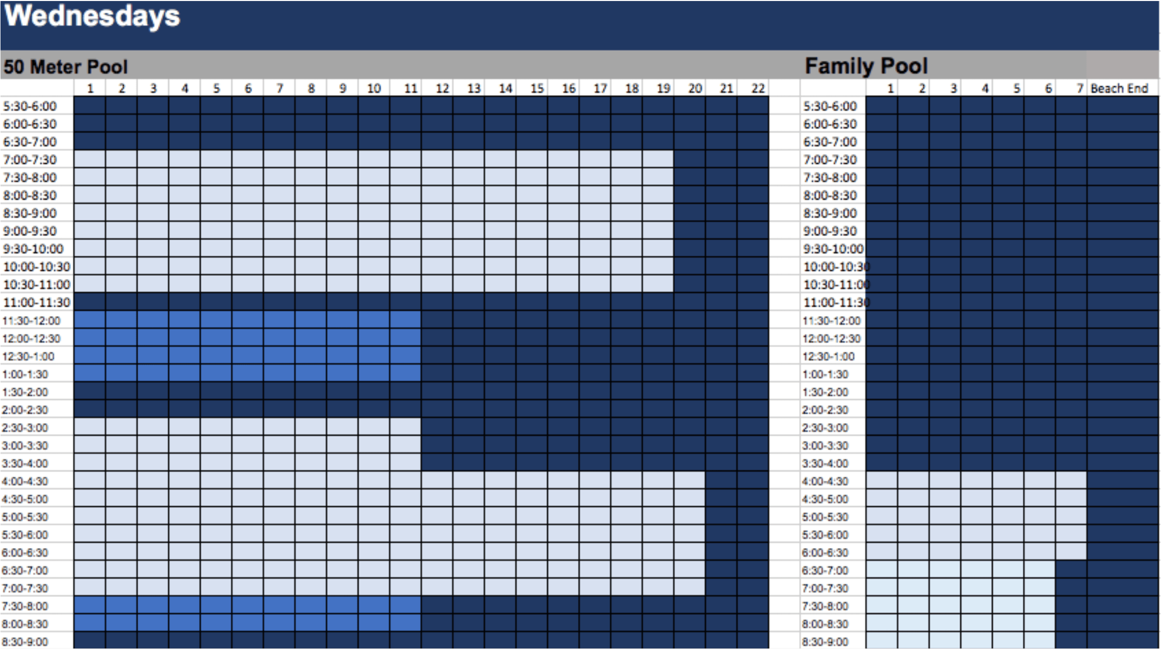 It’s helpful to plan your swim time in advance, and our assignment charts provide a snapshot of lane availability for each day. The busiest swim time during the school year is from 4:00pm-7:30pm. During that time, free swim lanes may be unavailable or limited.